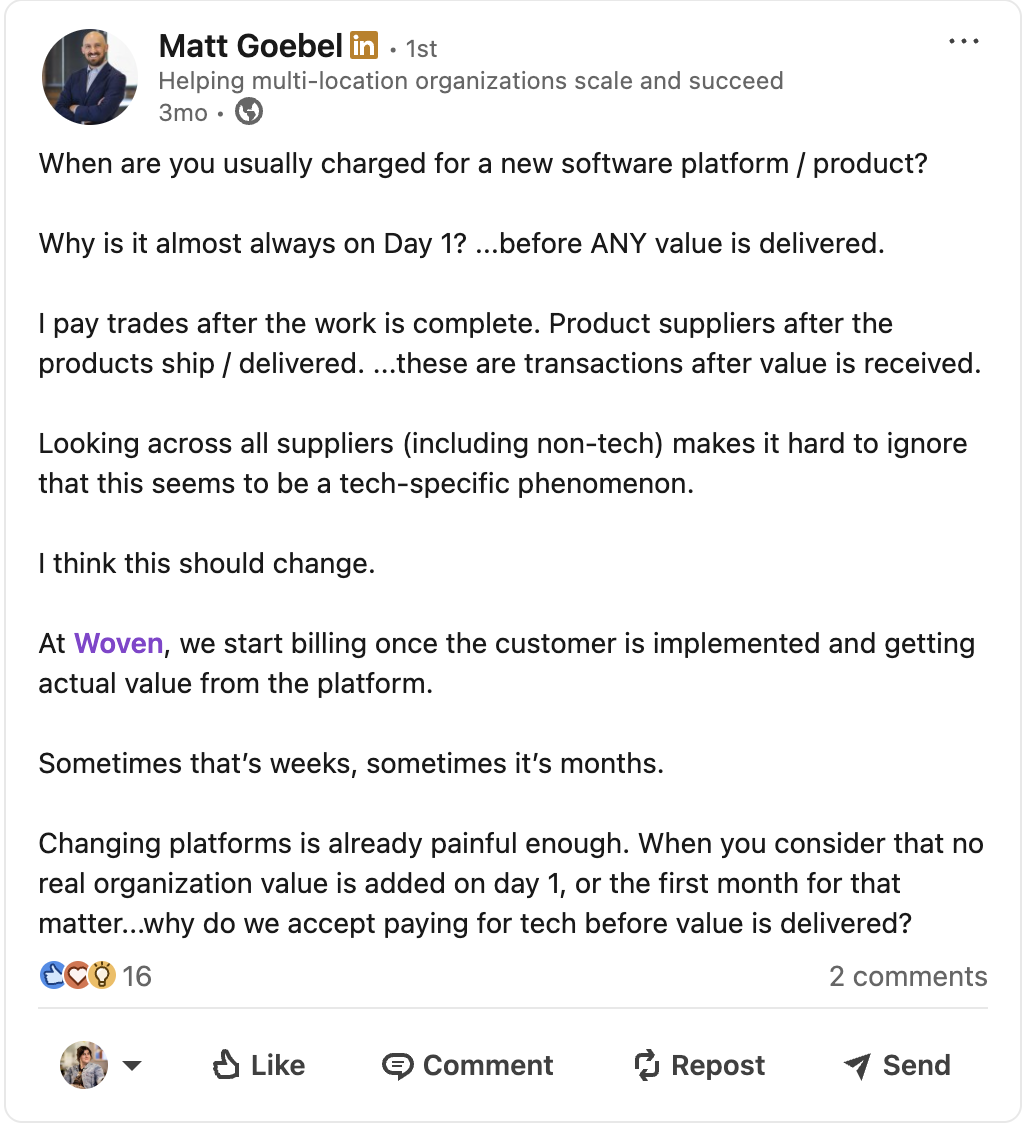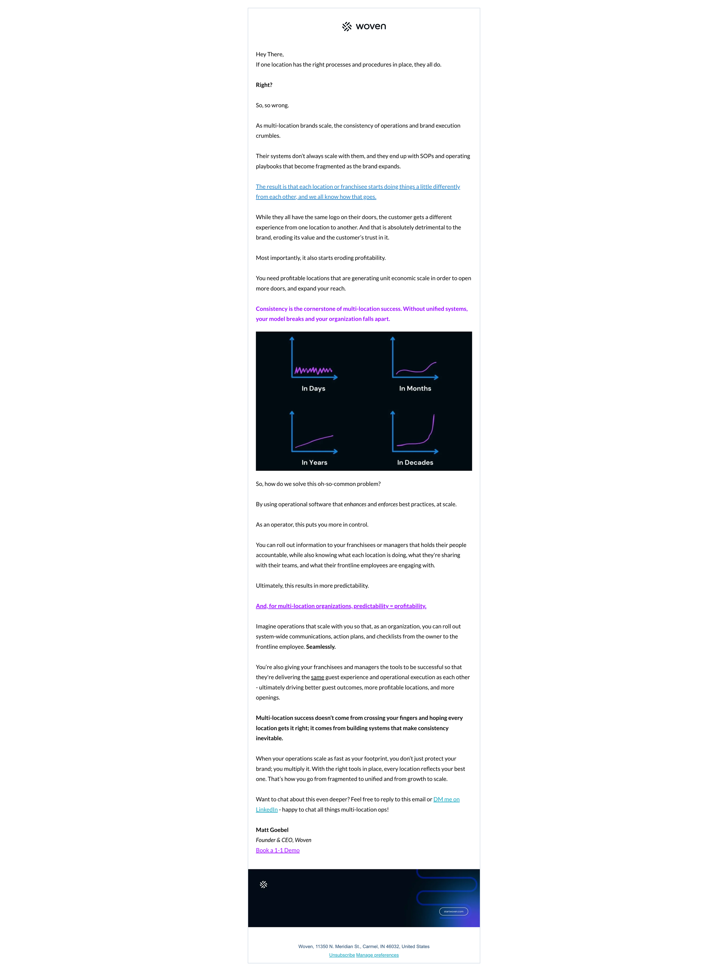 Woven had a strong product but a messaging problem. Their quarterly campaign wasn't converting the way it should, not because of traffic or reach, but because the narrative wasn't landing. Product value wasn't connecting to operator priorities, and the story wasn't consistent enough across channels to build the kind of trust that drives demo demand. At the same time, the founder had real expertise and genuine market authority that wasn't being activated. There was an opportunity to turn his voice into a demand channel, but it needed structure, strategy, and consistent execution to work.